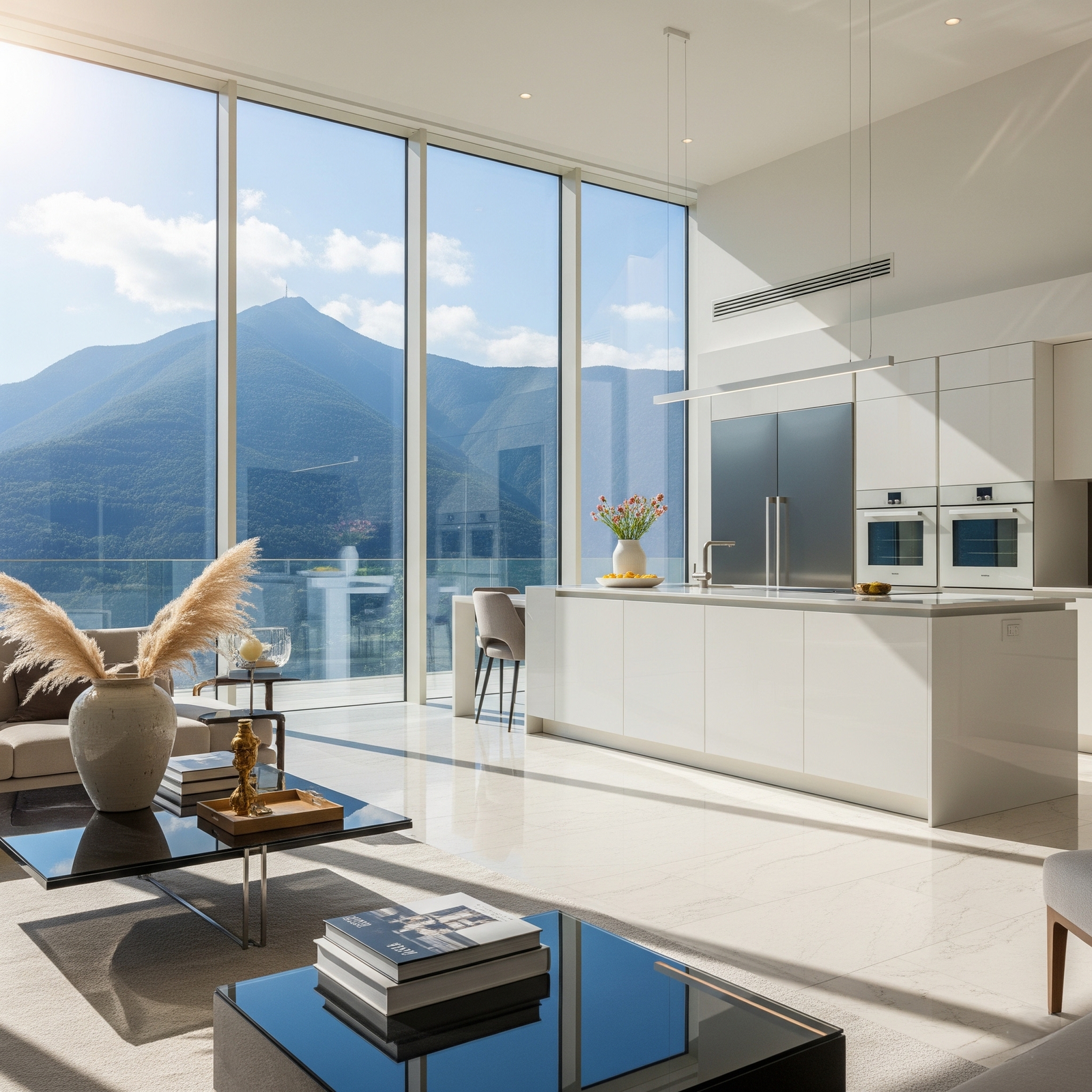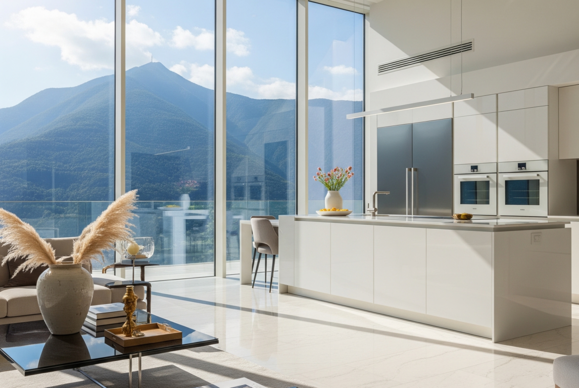 Exclusivo apartamento de lujo diseñado con un concepto abierto y acabados de primera categoría. Destacan sus amplios ventanales de piso a techo que inundan de luz natural todos los espacios y ofrecen una vista panorámica inigualable de la montaña.
